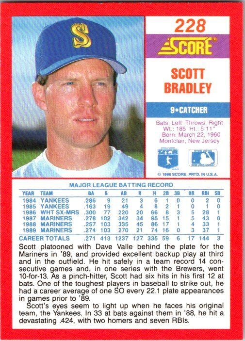 1990 Score Baseball Card Scott Bradley Seattle Mariners sk2669