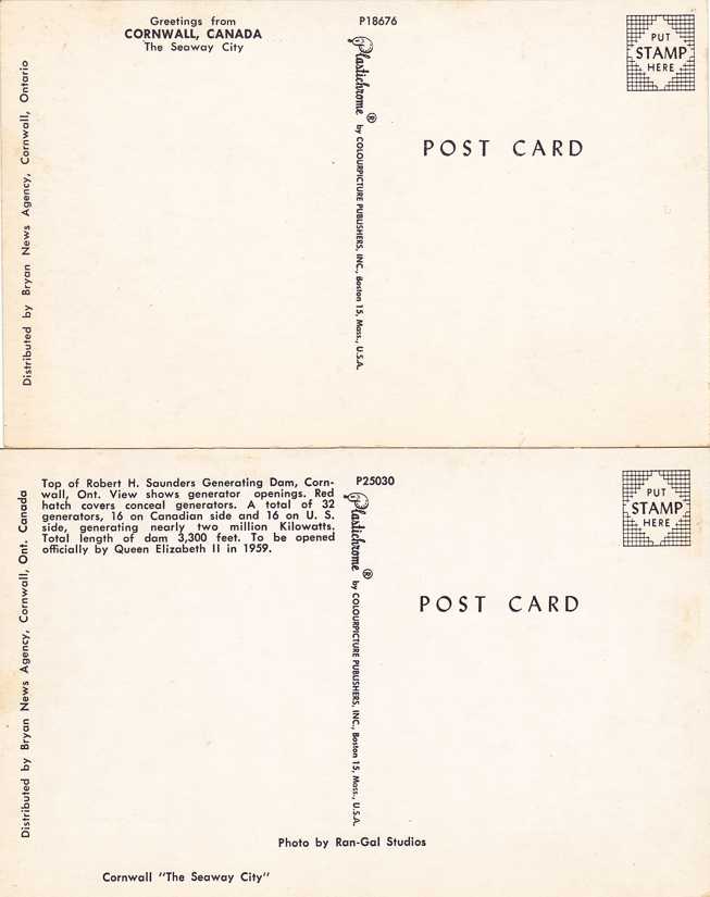 Greetings from Cornwall, Ontario, Canada. Robert Saunders Electricity Generating Dam. Standard sized chrome cards. Excellent condition.