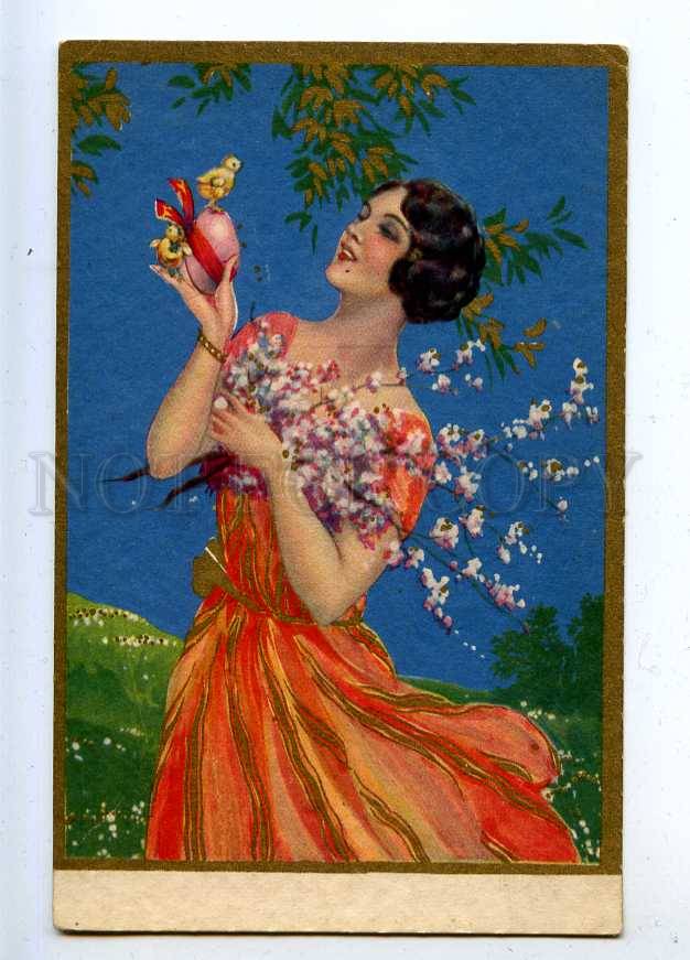 206688 ART DECO Lady EASTER Chicken by CORBELLA vintage PC