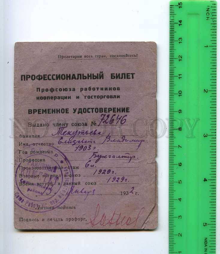 1932 YEAR USSR TRADE UNION TEMPORARY CERTIFICATE Trade union of workers of cooperation and state trade of the USSR temporary certificate 1932 year.Original vintage document with 10 stamps. Has a little breaks. We se ... Read More