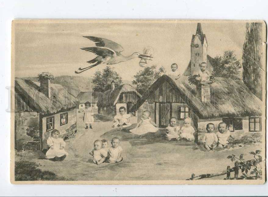 257490 Multiple babies w/ STORK Town Vintage COLLAGE postcard