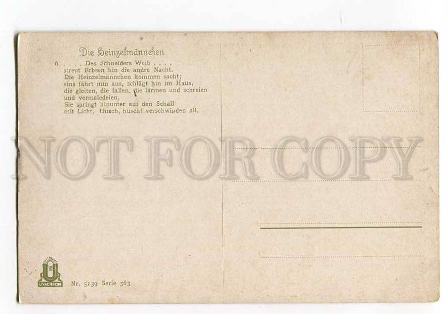 August kopisch - die heinzelmannchen - vintage original old postcard in excellent condition, for more information, see scans please, has a very small crease of one corner. Publisher uvachrom #5139 serie 363 - 6. Approx.Size: 5.5x3.5 inches (14x9 cm)