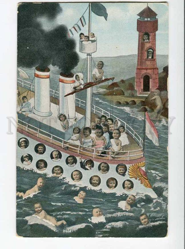 264943 MULTI-BABIES Liner Ship LIGHTHOUSE Vintage COLLAGE PC