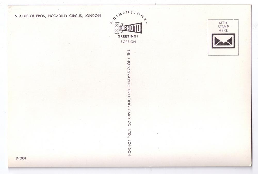 Statue of Eros Piccadilly Circus Title:    Statue of Eros Piccadilly Circus, London  Description:  Lenticular 3-D ERA/Style:       Publisher:    The Photographic Greeting Card Co. Size:   ... Read More