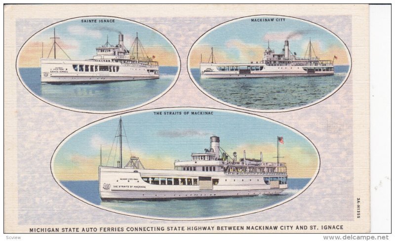 3-Views, Michigan State Auto Ferries Connecting State Highway Between Mackinaw City & St. Ignace, 1930-1940s :: Postcard, Size 3.5" by 5.5", Linen, EX.