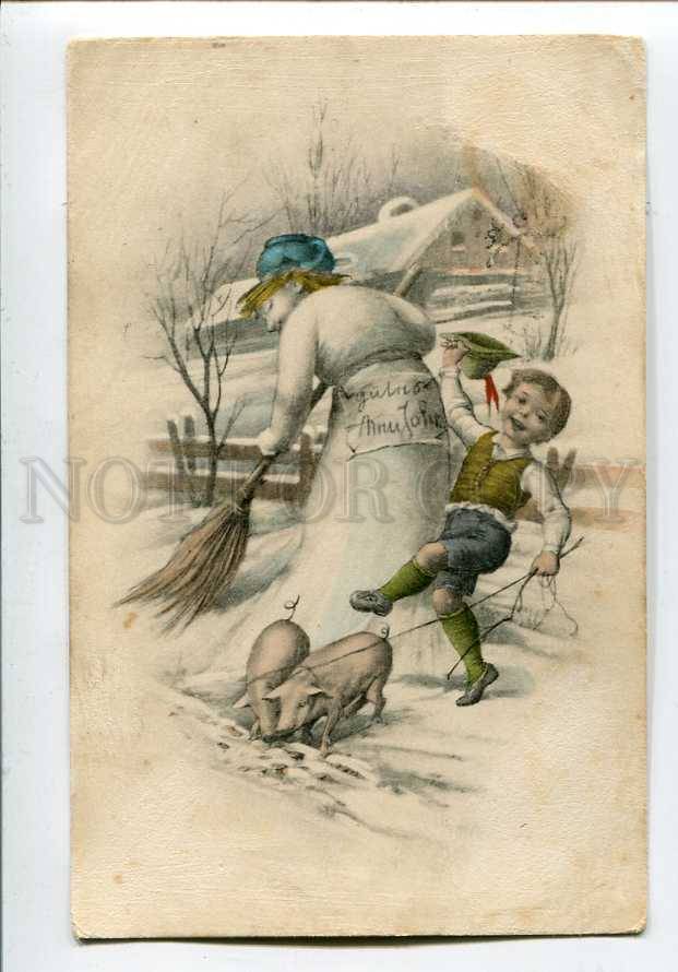 Winter boy dancing w/ pigs & snowman as yard keeper old Description: >>> Age: Vintage Original old postcard >>> Approx.Size: 5.5X3.5 inches (14X9 cm) >>> Publisher: B.K.W.I. >>> SERIES# 2939 >>> NUMBE ... Read More