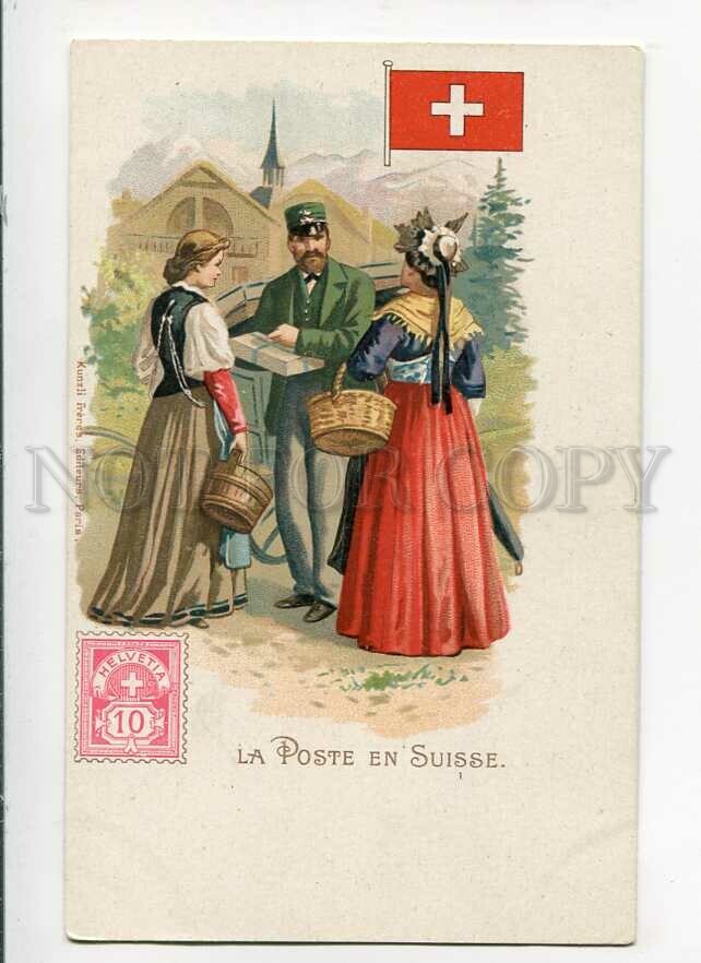 3090477 SWITZERLAND FLAG STAMP & postman Vintage lithograph PC
