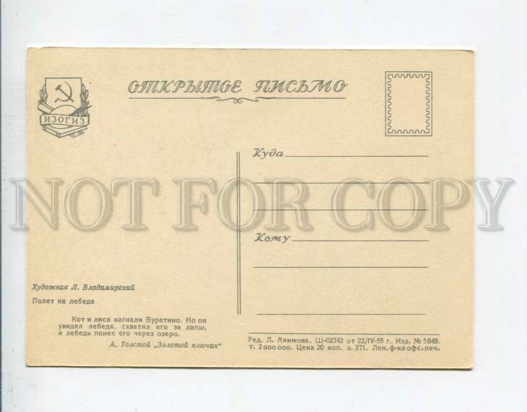 Flying pinocchio & dressed fox & cat old russian pc Description: >>> Age: Old original postcard 1955 year >>> Approx.Size: 6X4 inches (15X10.5 cm) >>> Publisher: IZOGIZ >>> Series# >>> Number# >>> ... Read More