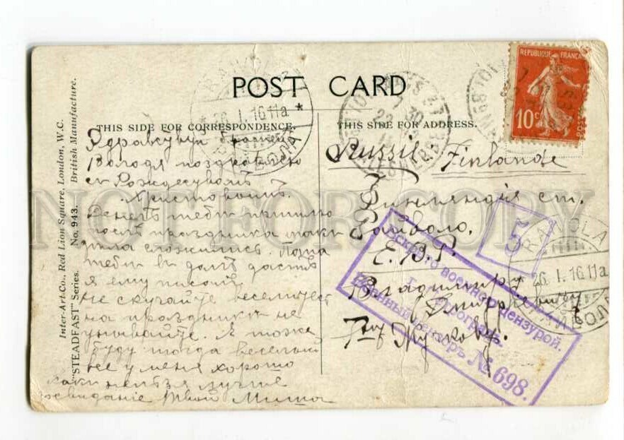>>> POSTALLY USED: RARE Postmark - Postal marking: =It is opened by military censorship. Petrograd. The military censor #698= in 1916 year - France - Finland Raivola Russia - Vladimir Dmitrievich Zhukov.