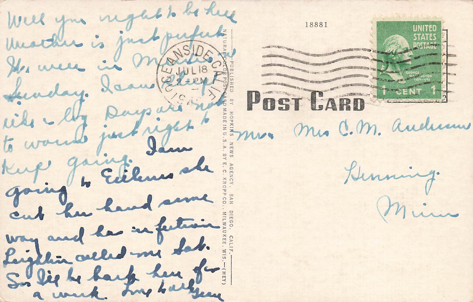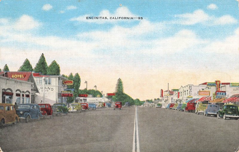 This is a nice vintage printed linen postcard showing a scene of Encinitas, California.