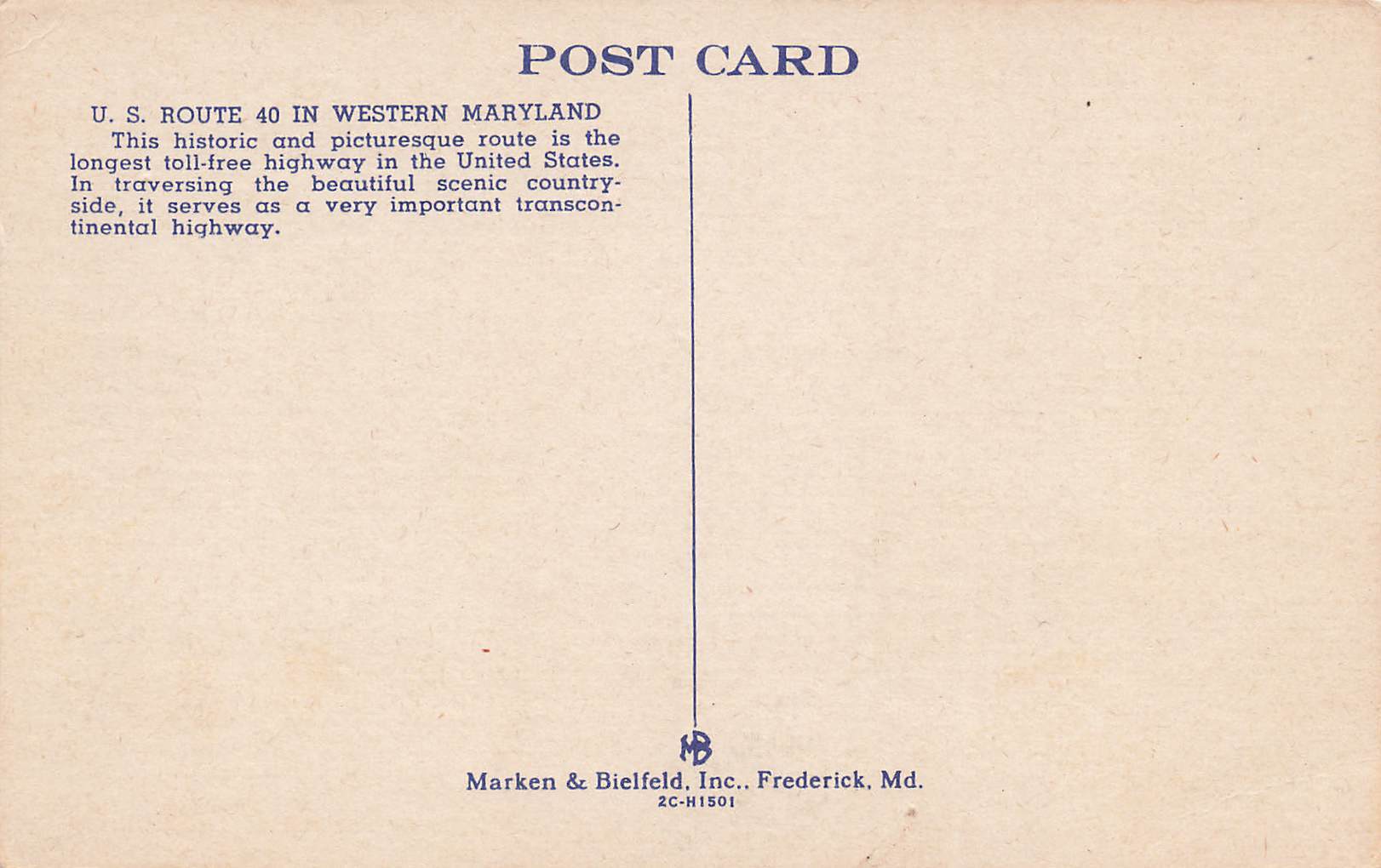 This is a nice vintage printed linen postcard showing a scene of US Route 40 Highway map in Maryland.Seller Information