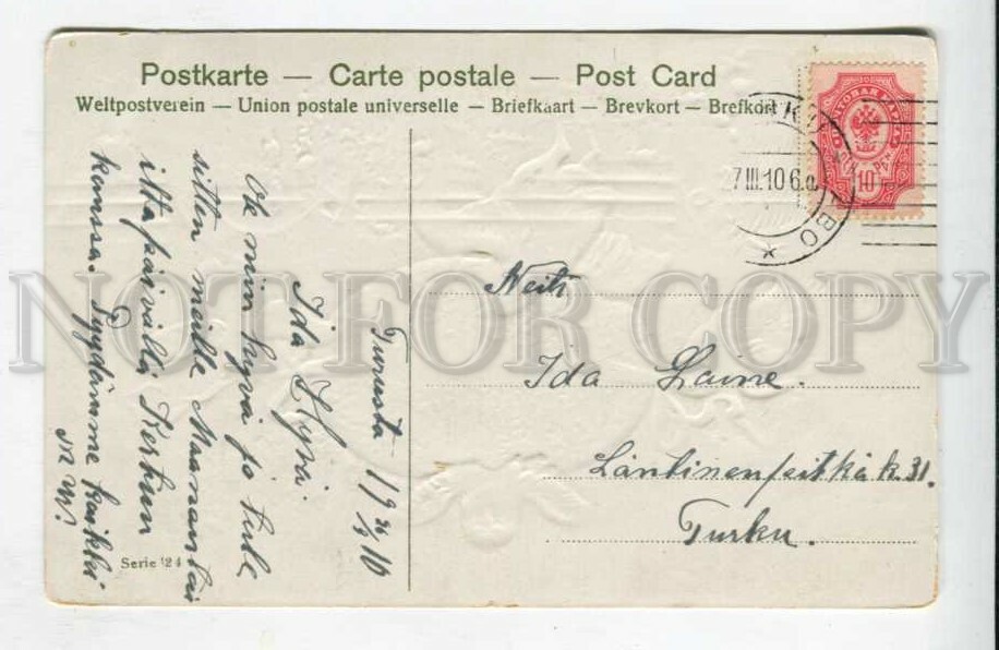 Vintage original old EMBOSSED postcard In excellent condition, for more information, see scans please. Postally Used in 1910 year - RUSSIAN FINNISH Finland POST Abo. Approx.Size: 5.5X3.5 inches (14X9 cm)