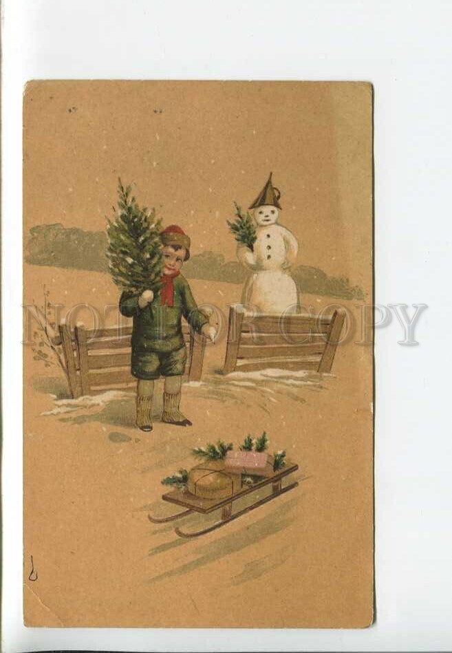 >>> Caption: NEW YEAR Boy Snowman Christmas tree RUSSIA Vintage postcard