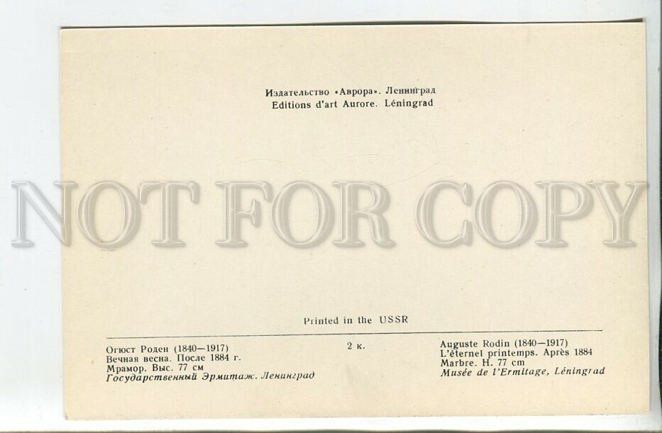 Ussr 1970 year auguste rodin eternal spring postcard Description: >>> Age: Old original postcard >>> Approx.Size: 5.5X3.5 inches (14X9 cm) >>> Publisher: Aurora Art Publishers USSR Russia Total print 1000 ... Read More