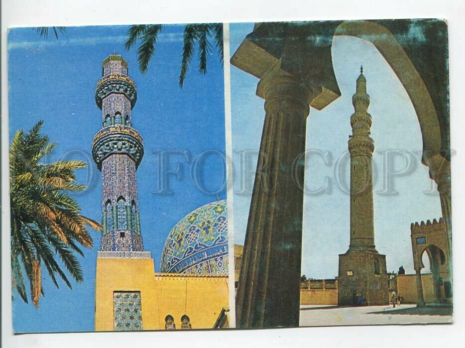 >>> Caption: Iraq mosque minarets Old postcard