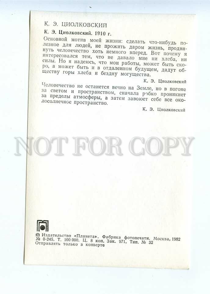 >>> CAPTION: USSR 1982 year Space Soviet missiles Rocket Designer Tsiolkovsky publishing house Planet postcard