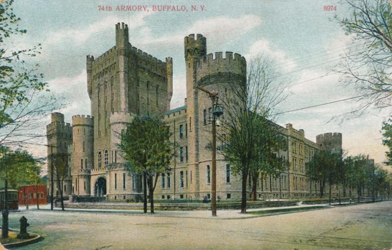 74th Armory at Buffalo, New York. Divided Back era Post Card (1907 to 1915 or so). Postmarked at Buffalo on November 4, 1908. Very good condition.