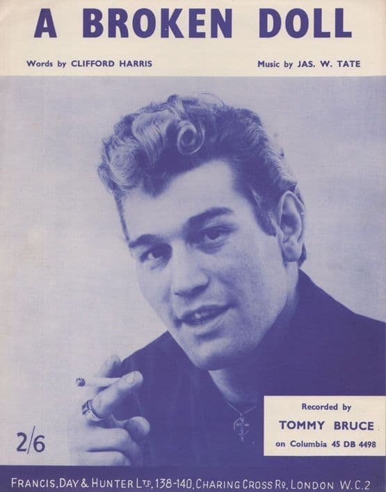 Vintage sheet music of A Broken Doll from Tommy Bruce to coincide with the release of his Columbia single charting (see image) and in truly excellent condition (mild darkening with age in small areas to cover - light corner to note - but superb and graded ex minus)