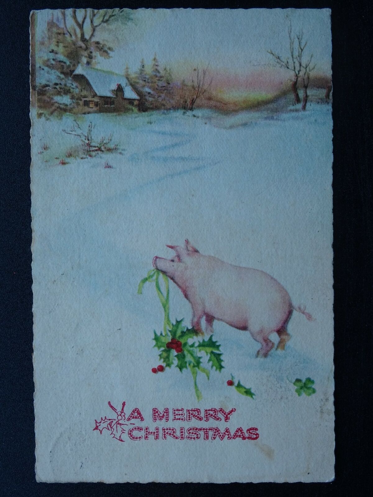 A Merry Christmas A PIG WITH HOLLY & FOUR LEAF CLOVER c1928 Postcard
