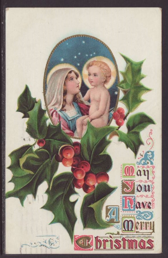 A Merry Christmas,Madonna,Child,Holly Postcard