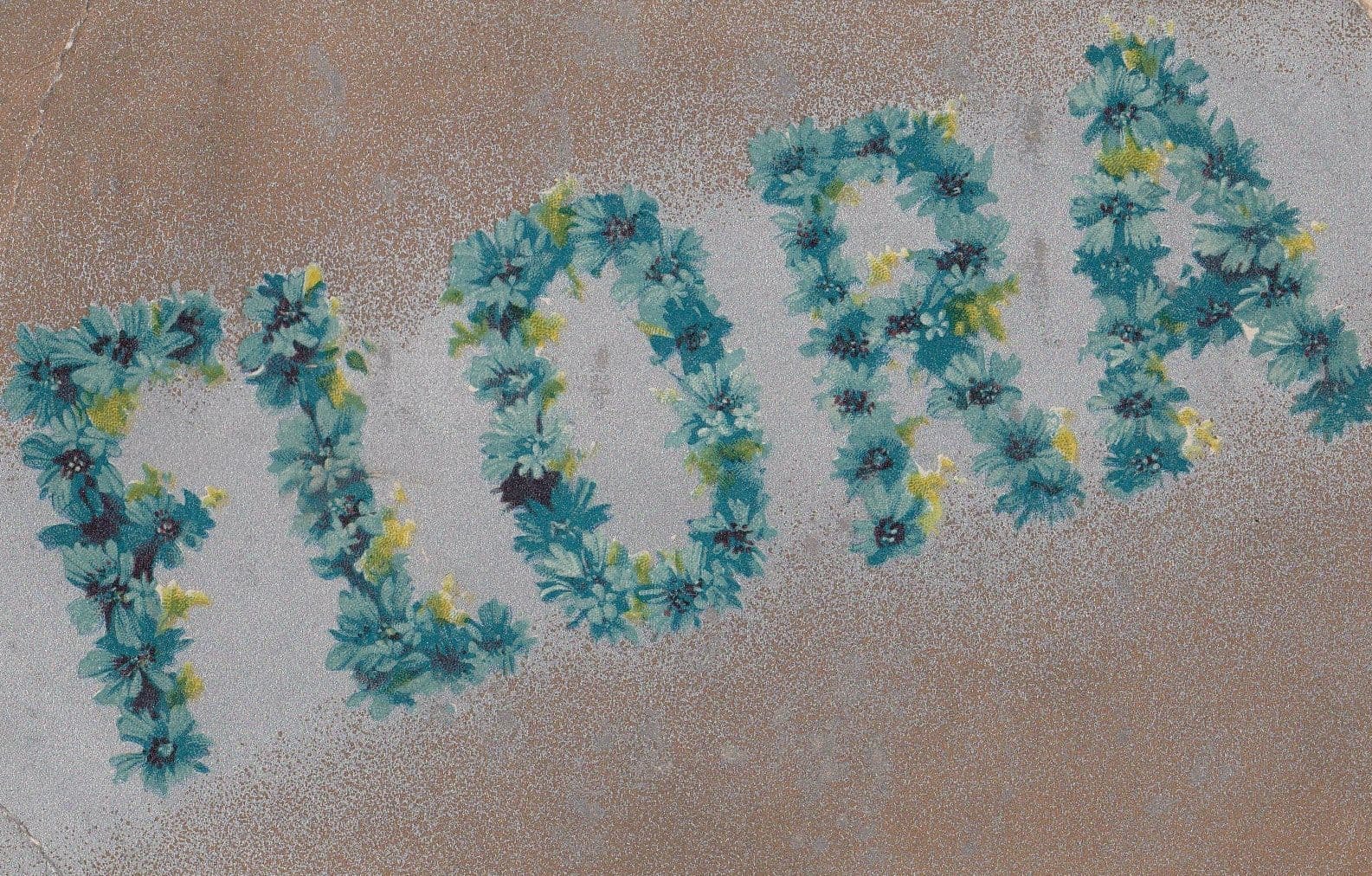 845 This is an undated but appears very early postcard and a wonderful souvenir with anyone with the name of Flora- it has the name surrounded by flowers on an almost glitter and certainly shiny background - please note has faults and aging graded good to good plus and please allow but a wonderful personalized old card