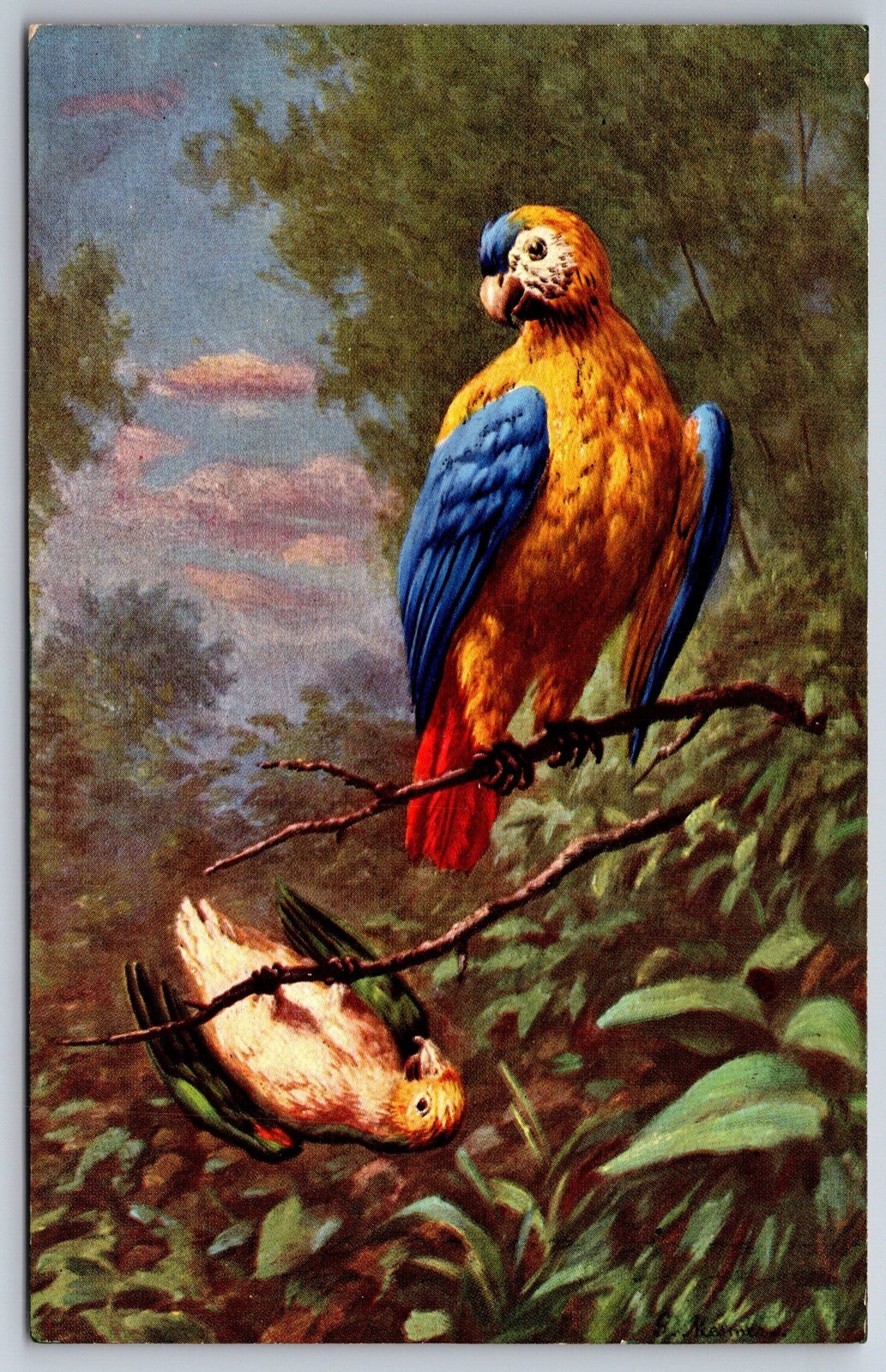 A/S~Two Macaw Parrots On Branch~One Hanging Upside-Down~P&CM Ser 121~c1910