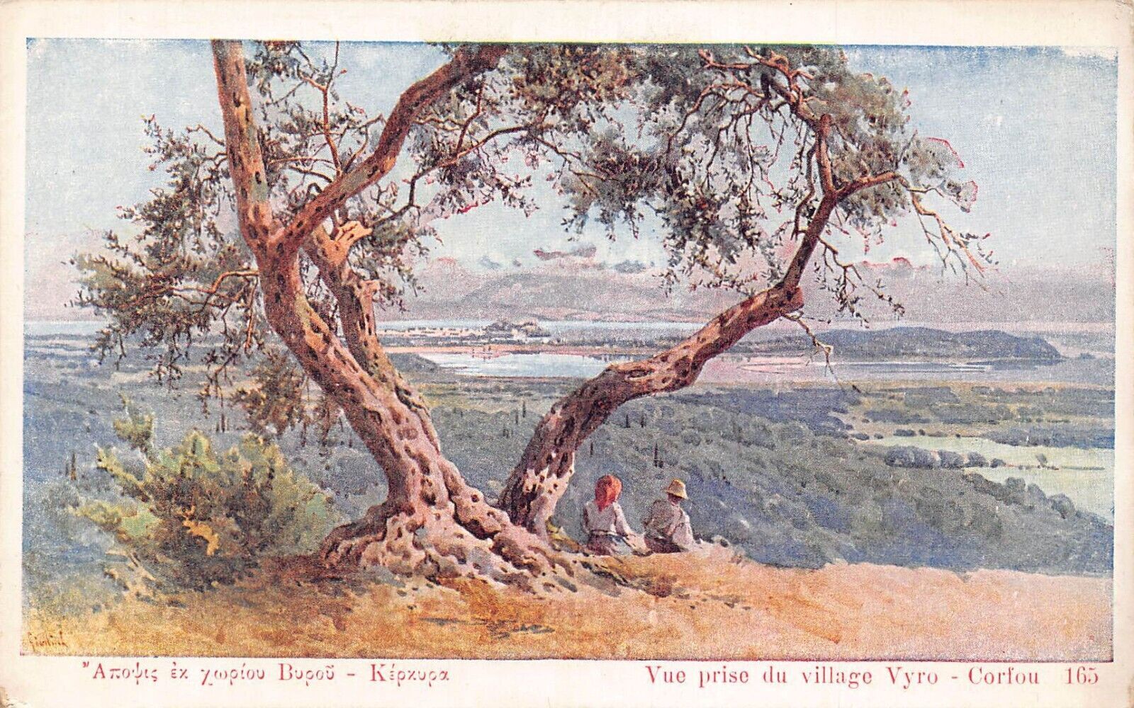 A025 Greece View of Vyro village Corfou couple under tree painting postcard