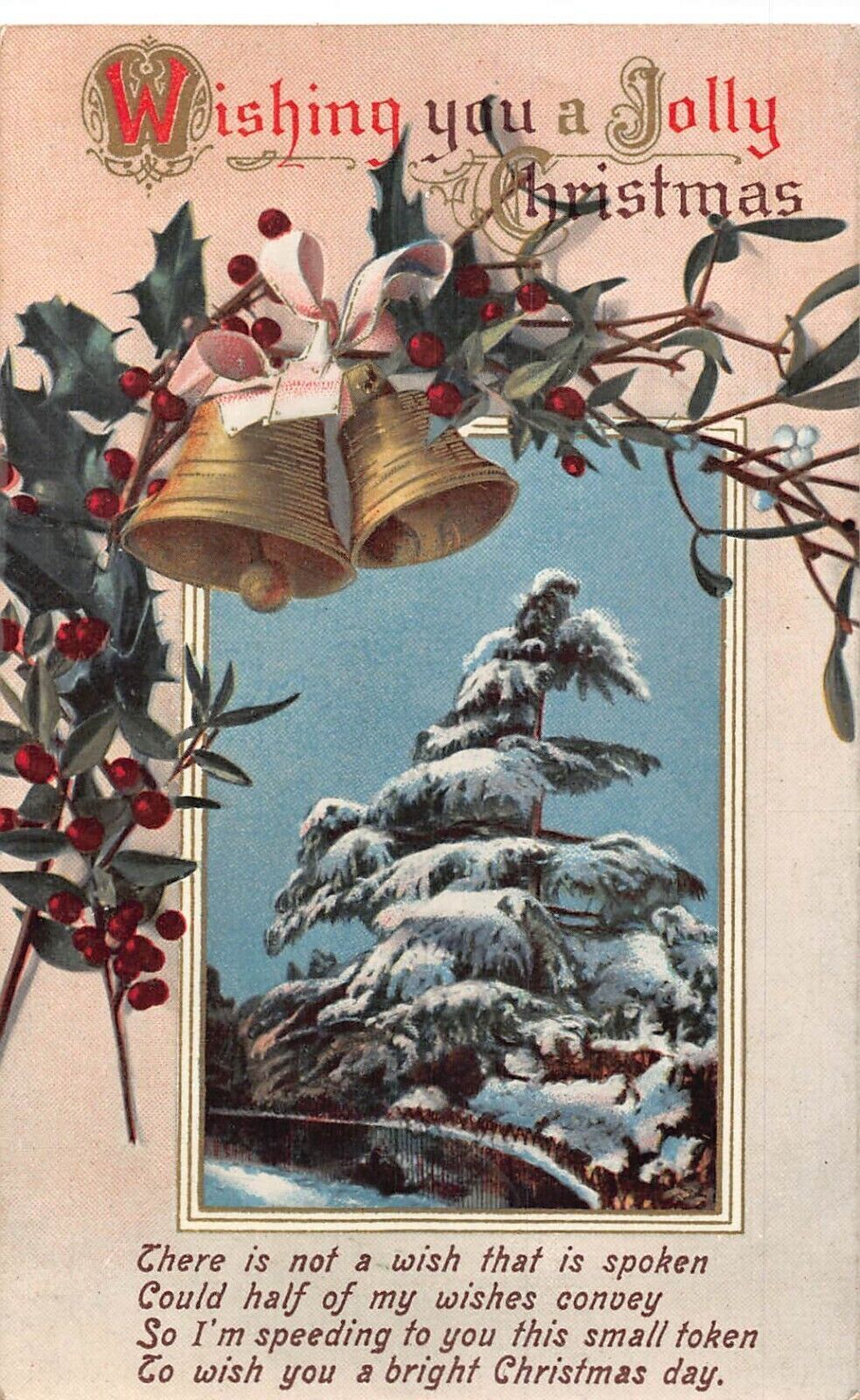 A055 Christmas greetings Pine tree Bells Mistletoe Poem ribbon postcard