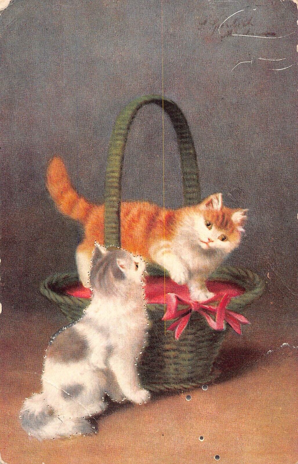 A112 Artist Card 1908 Two Kittens Playing Green Basket Bow signed postcard