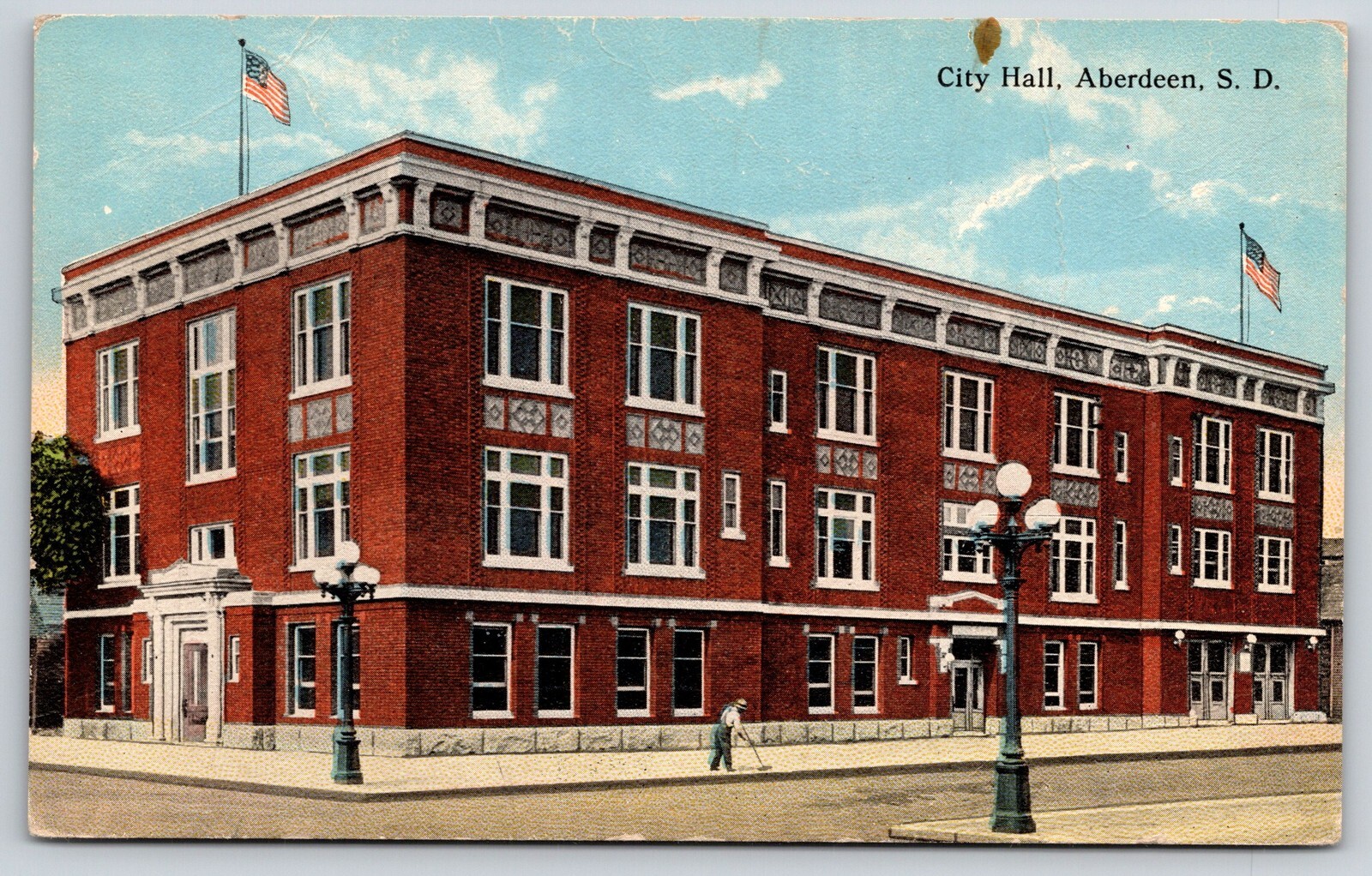 Aberdeen South Dakota~City Hall St View~Brick Bldg~Lamp~USA Flag~c1910 Postcard