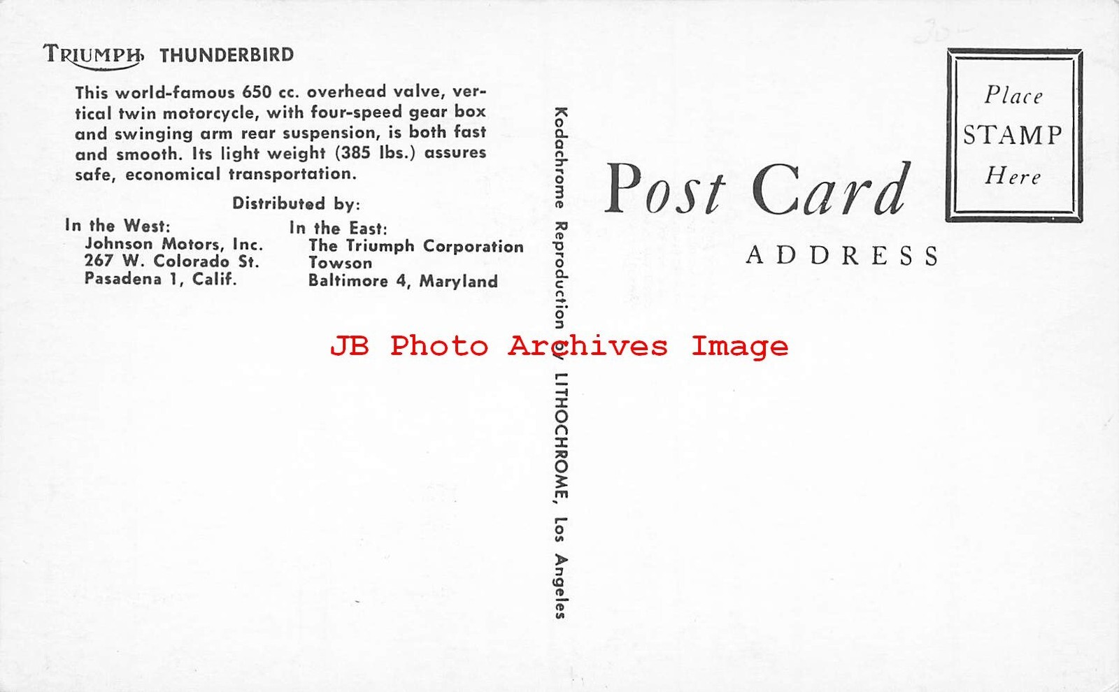 Advertising Postcard, Triumph Thunderbird Motorcycle, Television Gil Stratton Product Photo Click Image for Larger Preview Product Information This is a nice vintage printed advertising postcard promoting the Triumph Thunderbird Motorcycle. Publisher: Lithochrome. The corners have light wear. The image is bright and clean. Postally unused. Please Note: If you see a florescent colored line or streak on the postcard image it is from the scan, not on the card. The colors tend to come in Green, Yellow, Pink, Blue, Purple & Red. Shipping and Payment TERMS OF SALE: We Do Combine Shipping on Orders. Please wait for a combined Hip invoice with one shipping charge so that you can make one payment. Payment is due within three business days after closing of the auction or sale. Postage & Handling: We Do Combine Shipping on Orders. Please wait for a combined Hip invoice with one shipping charge so that you can make one payment. Orders of single postcards under $14.99 is $2.50 for postage and handling. Orders of single postcards $14.99-74.99 is $5.00 for postage, tracking and handling. All Orders $75.00 and greater may have additional postage, tracking and handling. International shipping is $4.50 for orders under $65. For orders $65 or higher there can be additional charges per listing so that the item can be mailed with tracking or USPS Registered Mail. Combining lots or group lots may be additional depending upon the weight of the package and number of payments. Large Group Lots and other items having specific shipping charges as per the listing. RETURN POLICY All items come with an unconditional 30-day return privilege. Each returned item must be in its original undamaged condition, shipped in the original hard sleeve and should be accompanied by a copy of our invoice. Any returned item should be shipped fully insured for your protection. We use AuctionHelper ! Guaranteed to sell more of your items!