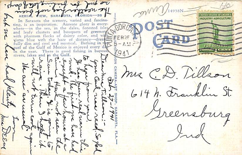 Aerial View Sarasota FL Postcard - 1941