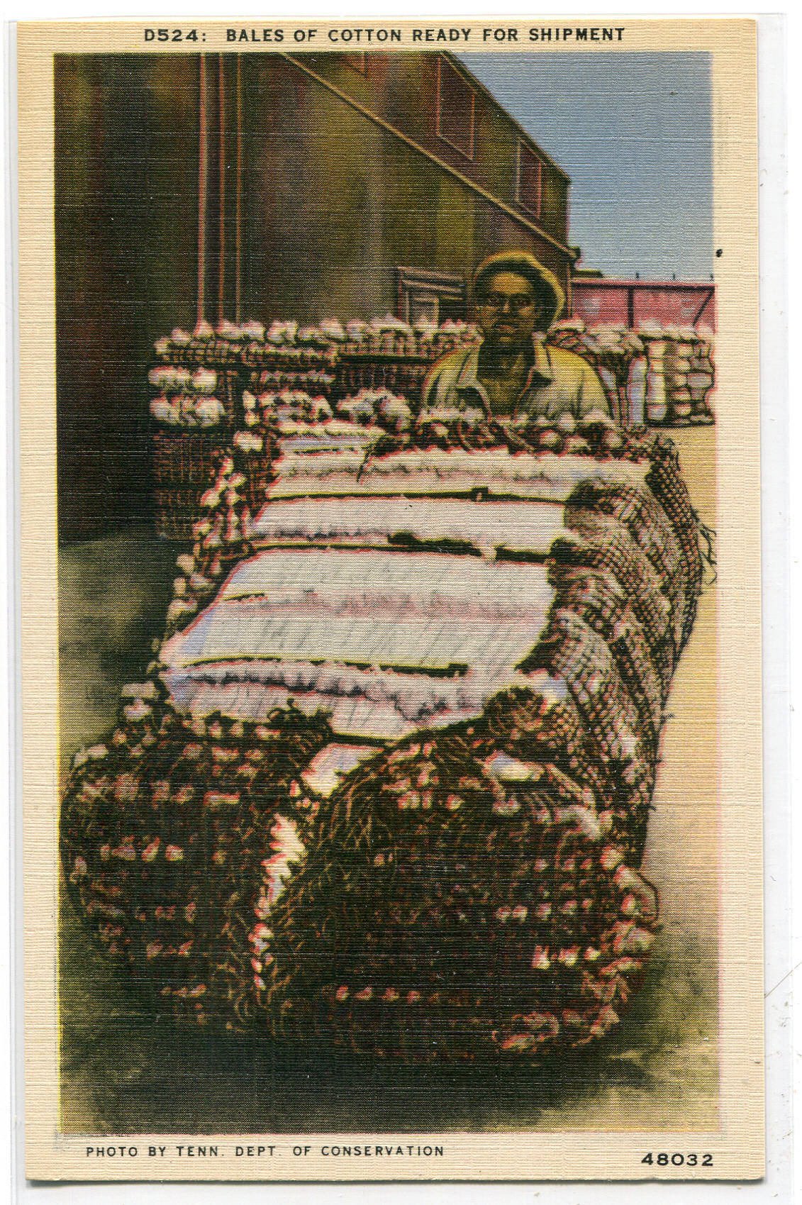 Description: African American Man Loading Cotton Bale Tennessee linen postcardType: linen, Tennessee Dept of Conservation