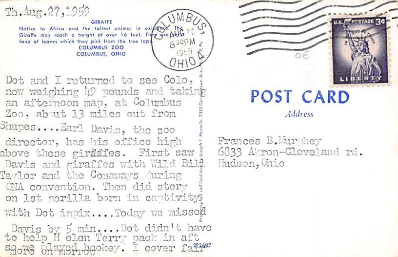 African Giraffe Giraffe Postcard 1959, Grade: 2, , Size: Regular Size Postcard - approximately 3 1/2 inch x 5 1/2 inch (9 CM x 14 CM) Grading Scale: Grade 1 = Perfect corners Grade 2 = Very Minimal corner wear, ... Read More