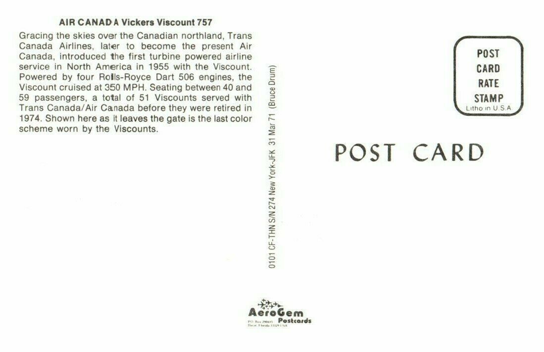 Condition: Pre-owned. May have mild edgewear, typical. Stored well. Some discoloration on the back, typical. Air Canada Vickers Viscount 757 Airplane Postcard