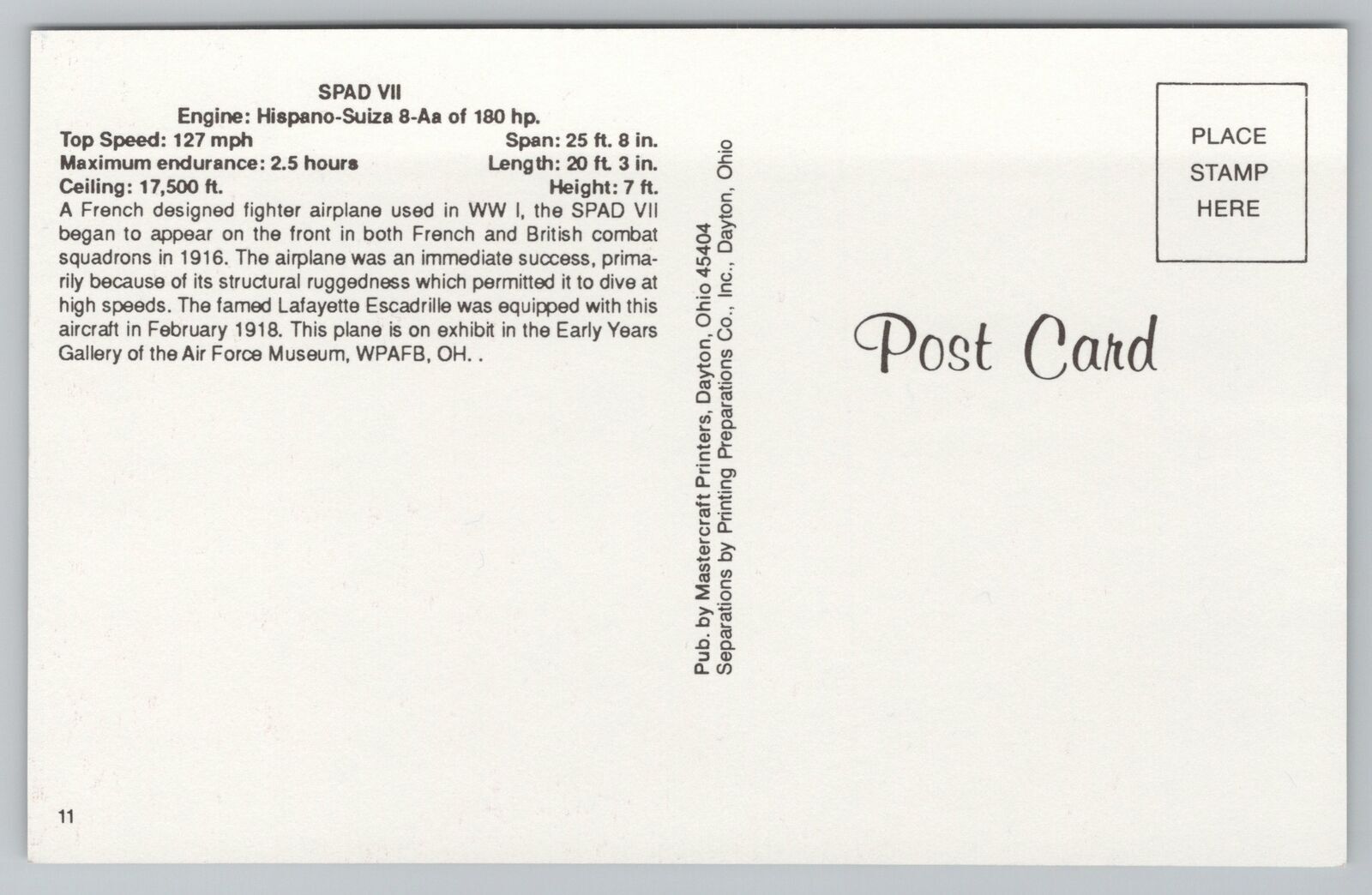 Aircraft~Spad VII~WWI~Air Force~Vintage Postcard
