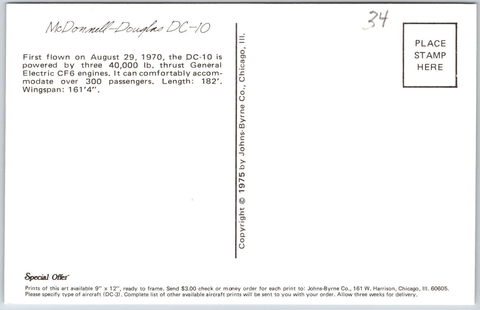 Airplane McDonnell-Douglas DC-10 300 Passengers Gen Electric CF6 Engine Postcard