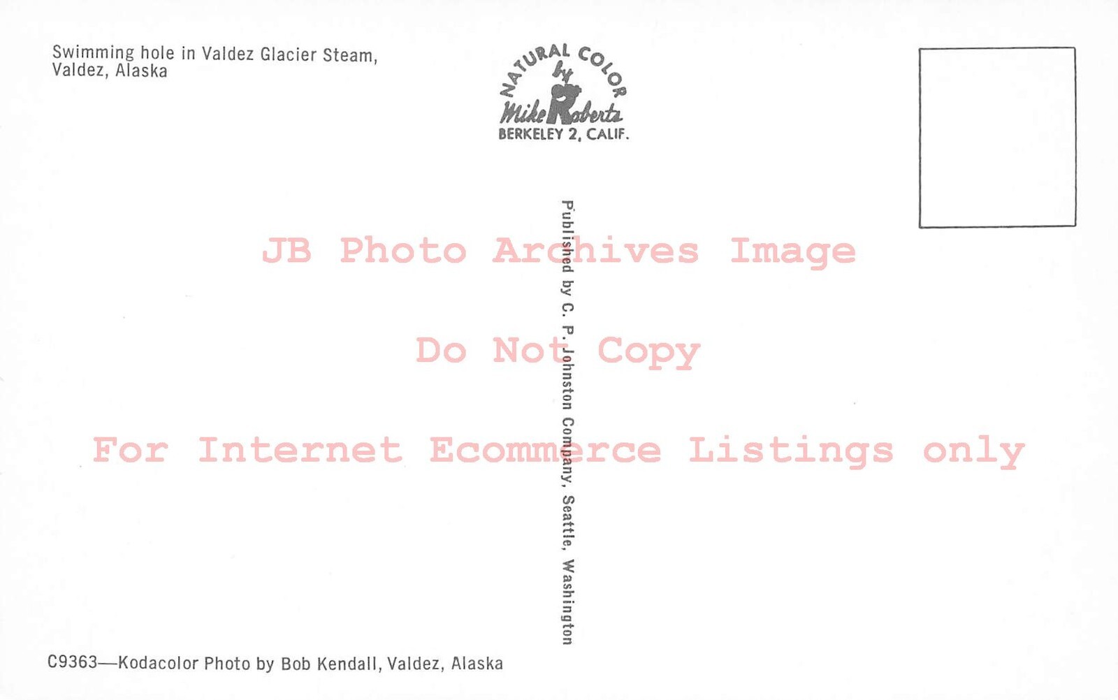 AK, Valdez, Alaska, Valdez Glacier Steam, Swimming Hole, Roberts No C9363 Product Photo Click Image for Larger Preview Product Information This is a nice vintage printed chrome postcard showing a scene of the swimmi ... Read More