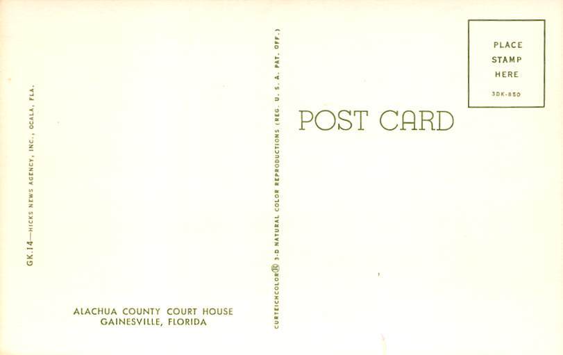 Alachua County Court House Gainesville FL Postcard - Unused Grade: 1 Size: R - Regular size: Approx 3 1/2 X 5 1/2 inch (9 cm X 14 cm) Grading Scale: Grade 1 = Perfect corners Grade 2 = Very Minimal corner wear ... Read More