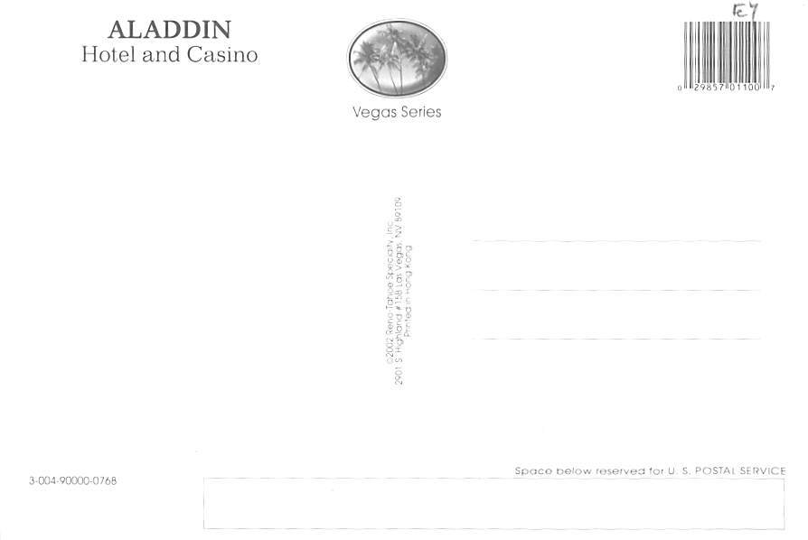 Aladdin Las Vegas, Nevada Grade: 1 Size: Continental Size - approximatly 4 Inch x 6 Inch (15 cm x 10.5) Grading Scale: Grade 1 = Perfect corners Grade 2 = Very Minimal corner wear, no creases Grade 3 = Some co ... Read More