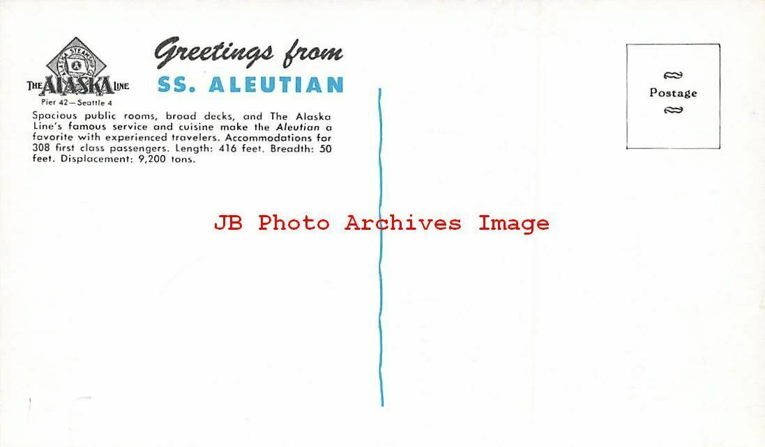 Alaska Steamship Company, Steamer Aleutian Product Photo Click Image for Larger Preview Product Information This is a nice vintage printed chrome postcard showing a scene of the Alaska Steamship Company, Steamer A ... Read More