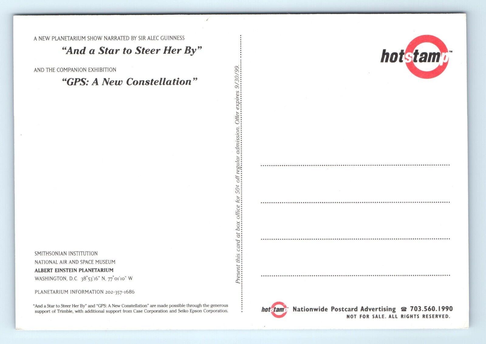 Vintage Divided Back Advertising Postcard Depicting Artwork for a New Planetarium Show Narrated by Sir Alec Guinness Entitled And A Star to Steer Her By a New Constellation at the Albert Einstein Planetarium Located in the National Air and Space Museum Smithsonian Institute in Washington DC. Measurements in inches - 4 x 6.May show signs of vintage age including staining, rough edges, discoloration, tape residue.Closely review photos for overall detailed condition.Postcard shipping is free via USPS packaged in a poly sleeve with post office to post office tracking only.Visit Sellz-It often for new postcard listings.We believe in reducing reusing recycling.