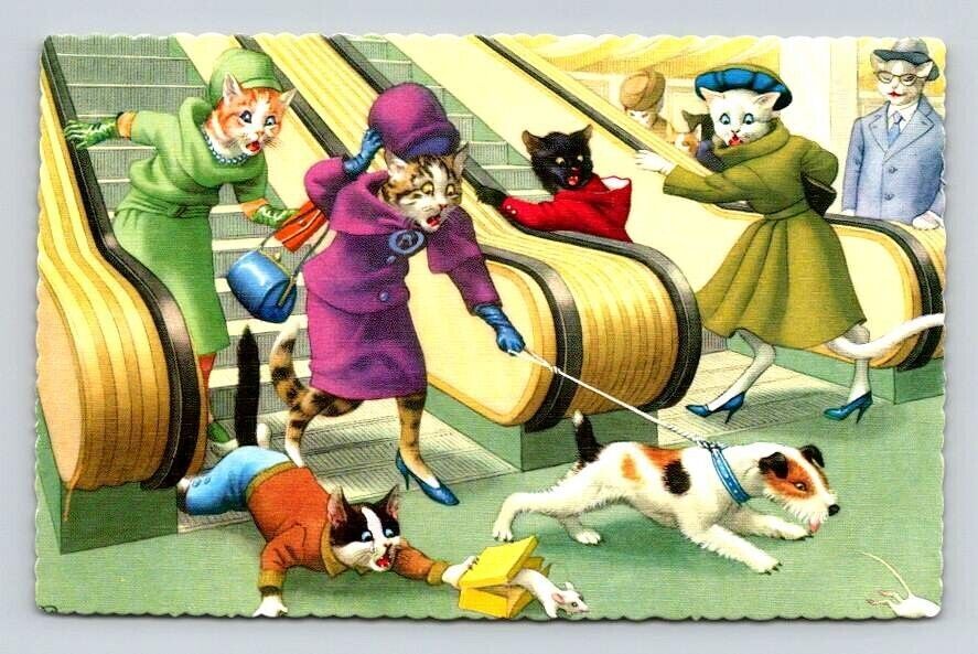 Alfred Mainzer Cats Escalator Mishap Anthropomorphic Postcard 4714