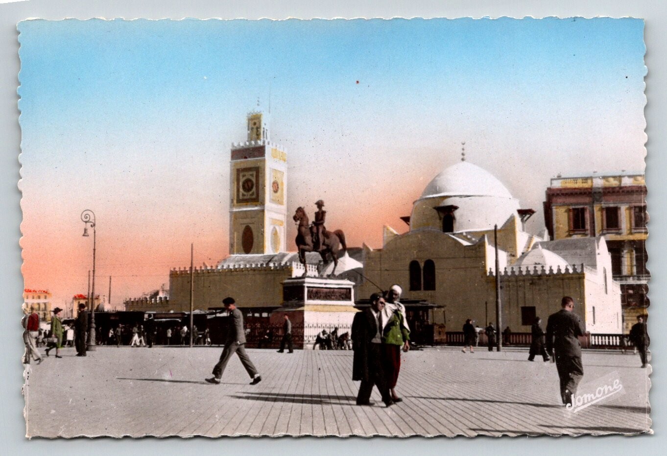 Discover a captivating piece of history with this vintage Real Photo Postcard (RPPC) depicting the bustling Place du Gouvernement in Algiers, Algeria. This meticulously hand-colored card captures a vibrant street scene, showcasing the iconic clock tower, a prominent domed building, and an impressive equestrian statue at the heart of the square. Numerous pedestrians animate the foreground, offering a glimpse into daily life during the early 20th century.Printed by Edition Jomone, this postcard is explicitly noted as a "Véritable Photo au Bromure," signifying its quality as a genuine bromide photographic print. The unique scalloped edges add to its antique charm, making it a distinctive addition for collectors of North African history, Algerian postcards, or early photographic prints. This piece serves as a beautiful visual document of Algiers' urban landscape and architectural heritage.