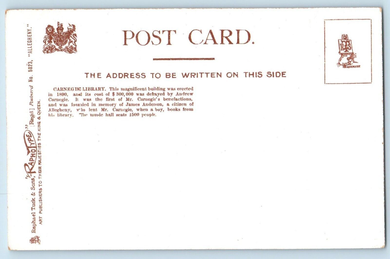Allegheny Pennsylvania Postcard Carnegie Library Exterior c1905 Raphotype Tuck