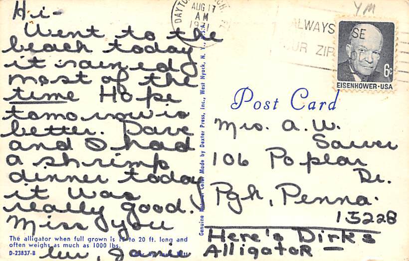 Alligator Alligator FL Postcard Postal Date: 1971 Grade: 2 Size: Regular Size Postcard - approximately 3 1/2 inch x 5 1/2 inch (9 CM x 14 CM) Grading Scale: Grade 1 = Perfect corners Grade 2 = Very Minimal co ... Read More