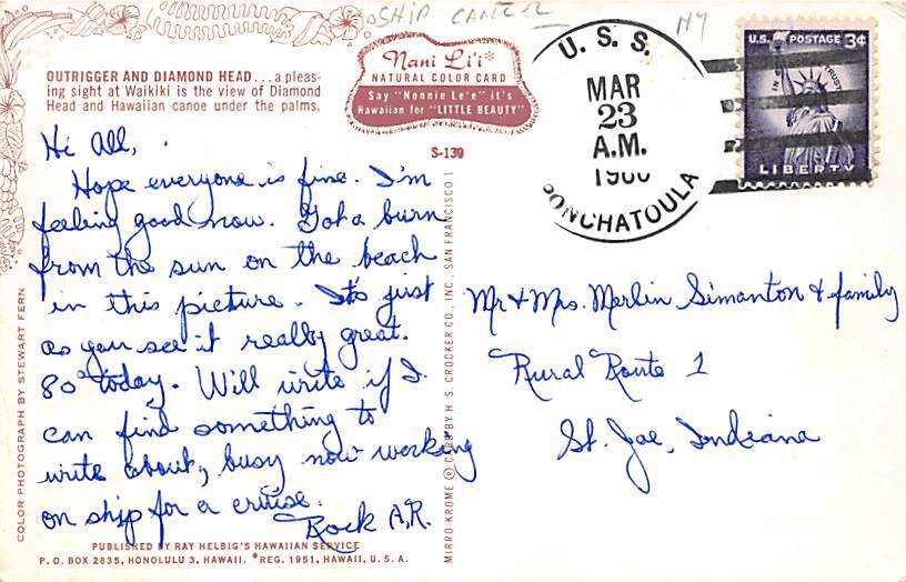 Aloha from Hawaii Ship Cancel Postcard PU Unknown, Grade: 3, , Size: Regular size: Approx 3 1/2 X 5 1/2 inch (9 cm X 14 cm) Grading Scale: Grade 1 = Perfect corners Grade 2 = Very Minimal corner wear, no creas ... Read More