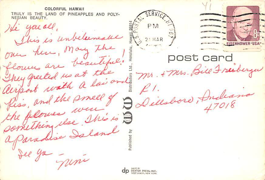 Aloha From , The Land Of Pineapples Postcard - View Images Grade: 1 Size: C - Continental Size Postcard - approximately 4 inch X 6 inch (15 CM X 10.5 CM) Grading Scale: Grade 1 = Perfect corners Grade 2 = Very ... Read More