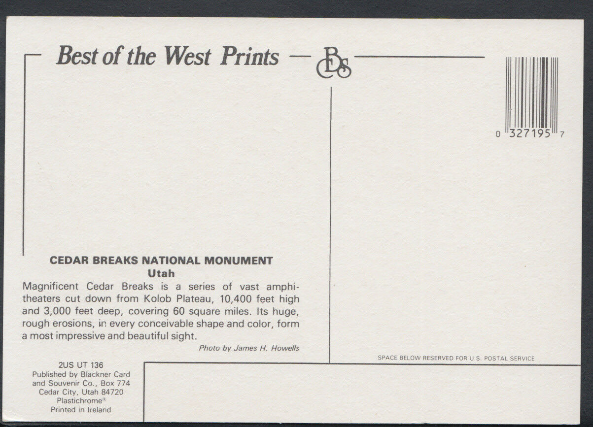 Mo's Postcards Postcard Description: America Postcard - Cedar Breaks National Monument, Utah Genealogy Information: Defect(s): Postage & Payment: For U.K residents the quoted P & P fee is for any number of postcards ... Read More