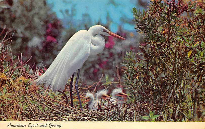American Egret And Babies Bird Postcard 1968, Grade: 2, , Size: Regular Size Postcard - approximately 3 1/2 inch x 5 1/2 inch (9 CM x 14 CM) Grading Scale: Grade 1 = Perfect corners Grade 2 = Very Minimal corne ... Read More